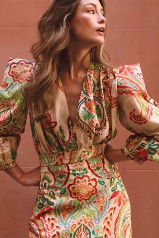 Andrea Baskılı Omuzu Açık Puf Kol Katlı Maxi Elbise