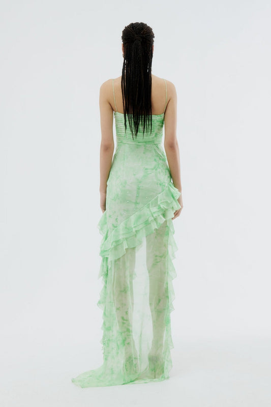 Agnes Baskılı Asimetrik Fırfırlı Maxi Elbise
