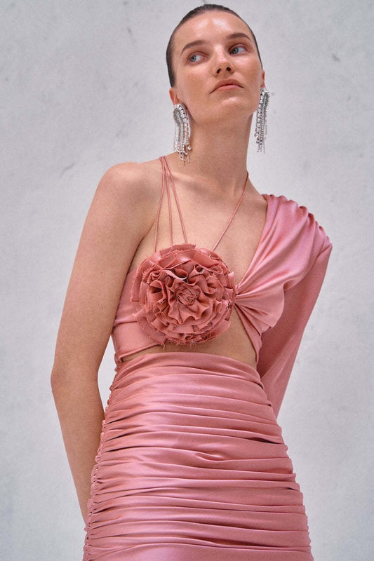 Dyanna Saten Tek Omuzlu Dökümlü Midi Elbise