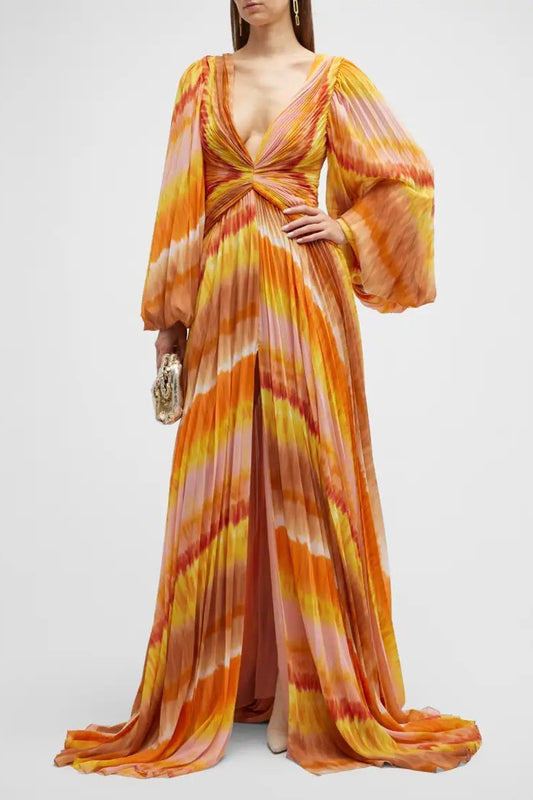 Doreen Baskılı Fırfırlı V Yaka Katlı Maxi Elbise