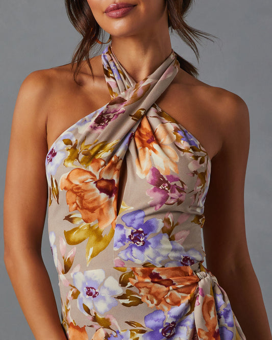 Floral Beauty Büküm Önü Boyundan Bağlamalı Midi Elbise