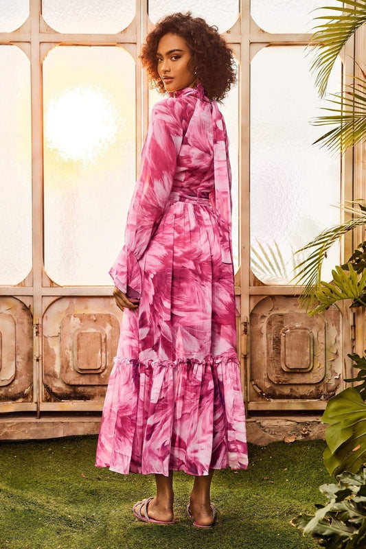 Ginny Baskılı Fırfırlı Bağcıklı Şifon Maxi Elbise