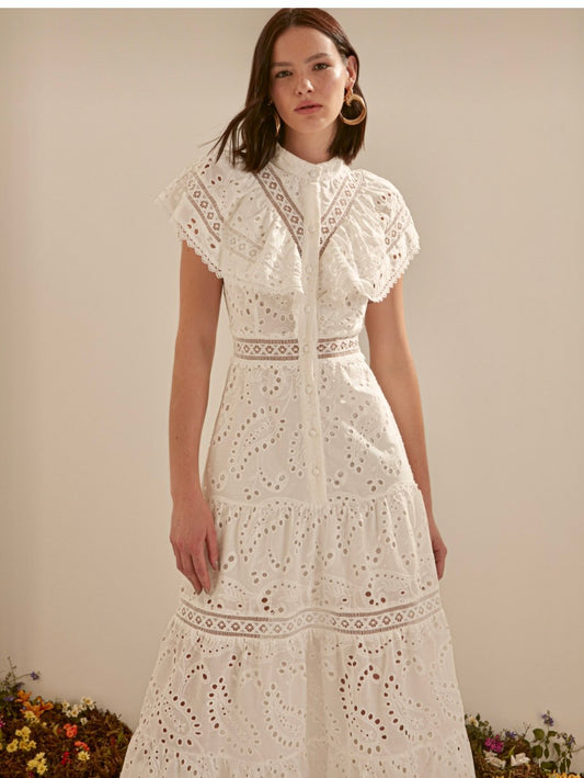 Kit Nakışlı Dantel Fırfırlı Düğmeli Midi Elbise
