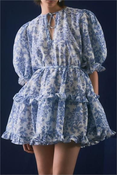 Lila Çiçekli Fırfırlı Puf Kol A Kesim Mini Elbise