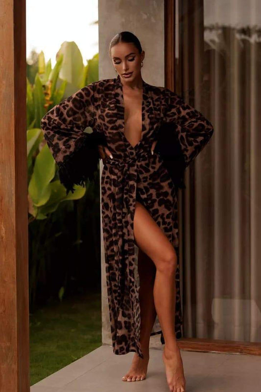 Natalie Leopar Desenli Tüylü Maxi Bornoz
