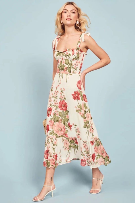 Nita Baskılı Büzgülü Korsajlı Fırfır Askılı Midi Elbise