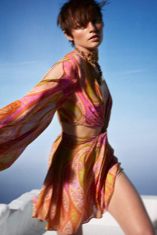 Renee Baskılı Fırfırlı V Yaka Mini Anvelop Elbise