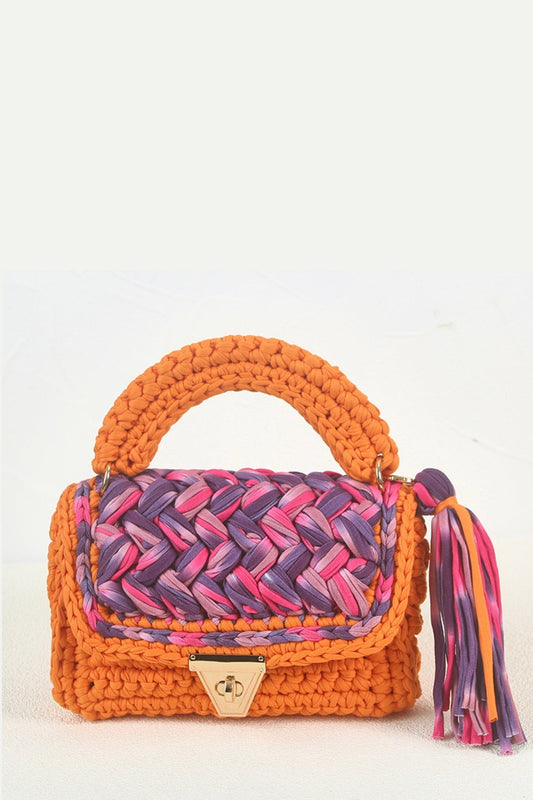 Tara Kontrast Renk Dokuma Püsküllü Kapaklı Çanta