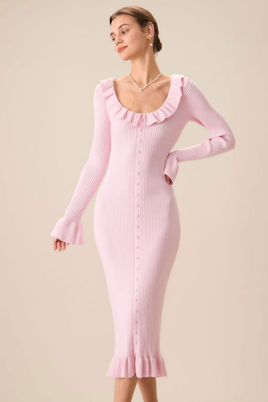 Valerie U Yaka Fırfırlı Midi Triko Elbise