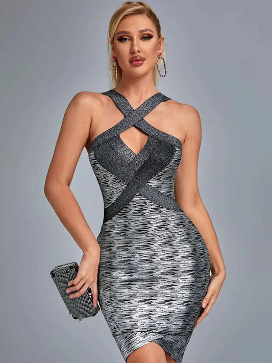 Alevna™ Gri Yüksek Yaka İşlemeli Midi Kılıf Elbise
