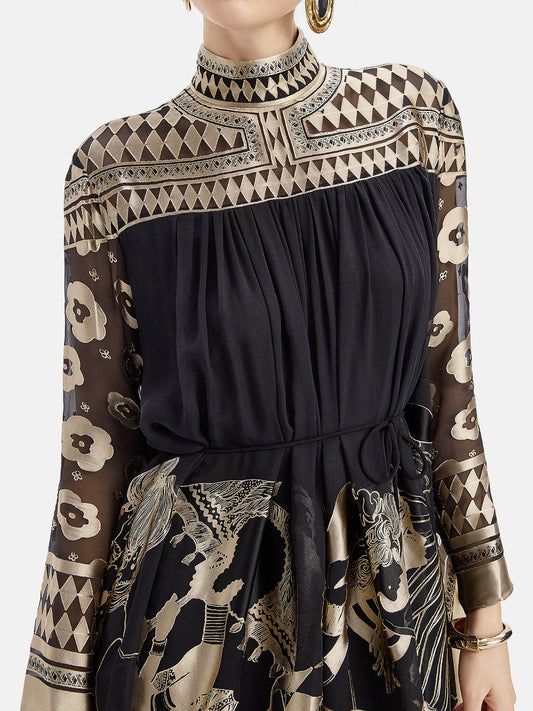 Vintage Siyah Ve Altın Baskılı Batwing Pelerin Elbise