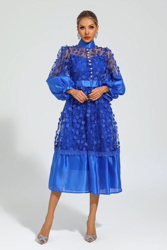 Lillie Mavi Örgü Çiçek Midi Elbise