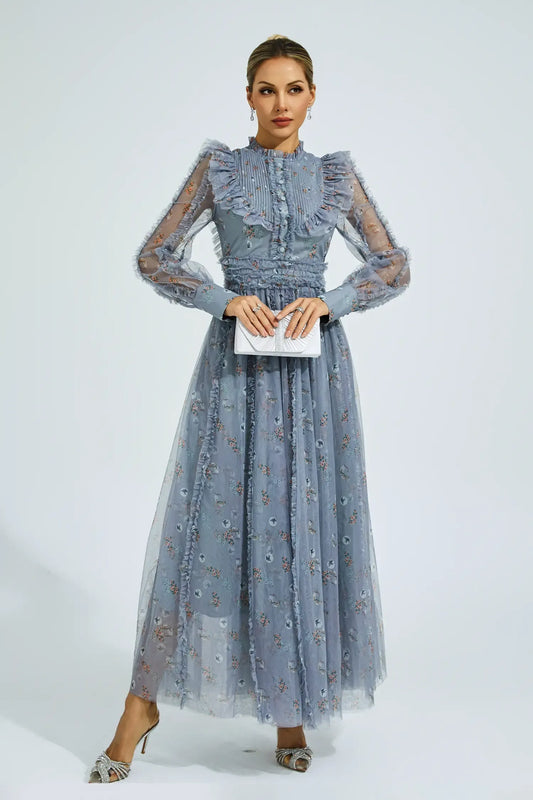Elara Mavi Çiçekli Uzun Kol Uzun Elbise