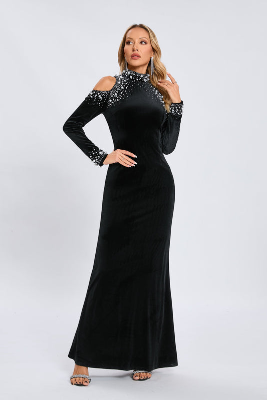 Delilah Siyah İncili Düşük Omuz Uzun Elbise