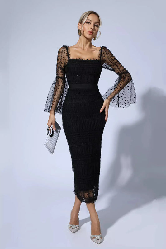 Rosalinde Siyah Dekolteli Fileli Bandaj Uzun Elbise
