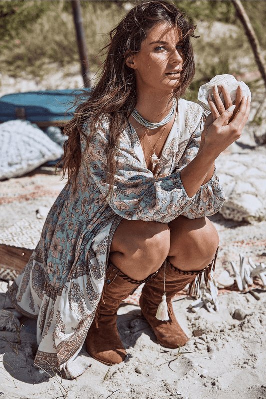 Chaya Baskılı V Yaka Cut-Out Flare Maxi Elbise