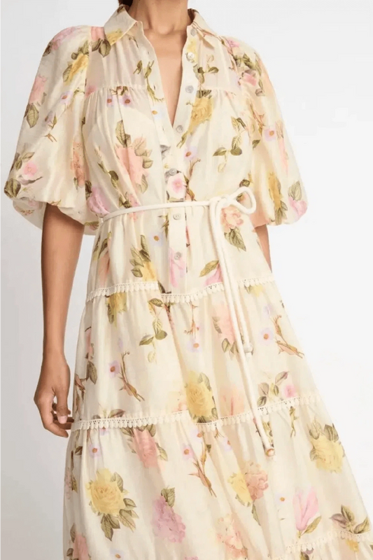 Alva Baskılı Dantelli Puf Kol Katlı Uzun Gömlek Elbise