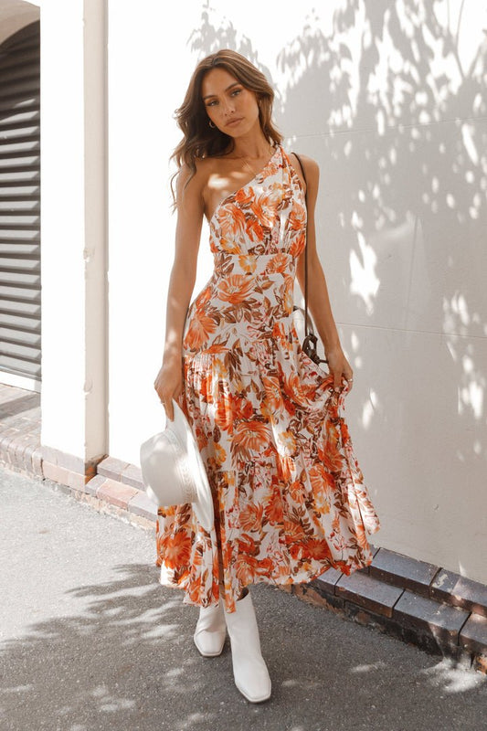 Hedda Baskılı Tek Omuz Katlı Uzun Elbise