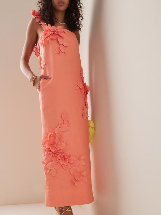 Evelyn Çiçek İşlemeli Keten Midi Sütun Elbise