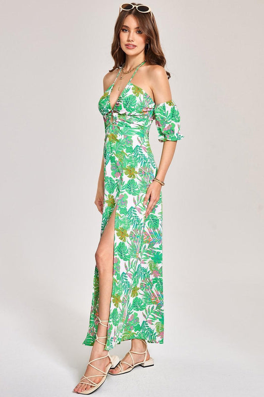 Apphia Baskılı Boyundan Bağlamalı Yırtmaçlı Midi Elbise