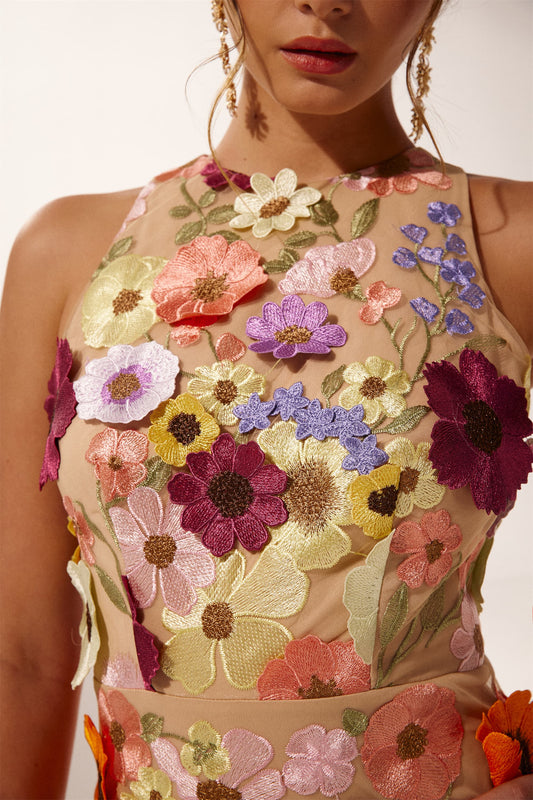 Andrea Çiçek İşlemeli Kolsuz Uzun Elbise
