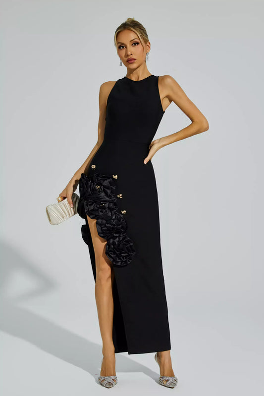 Darcy Siyah Gül Yırtmaçlı Bandaj Maxi Elbise