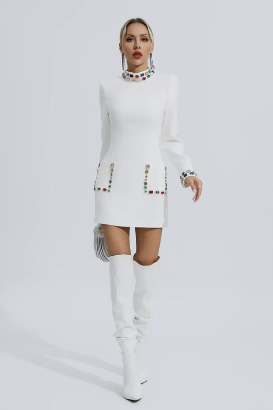 Karina Beyaz Pırlanta İşlemeli Mini Elbise