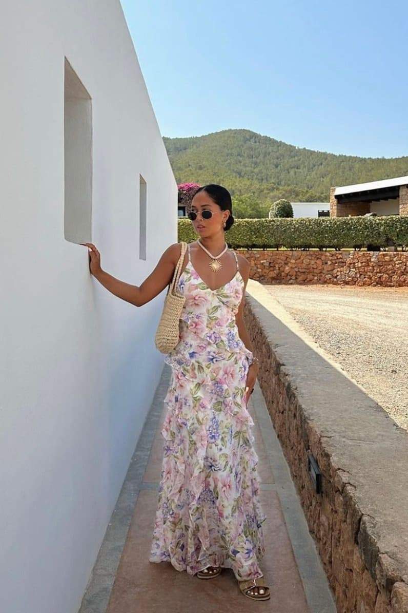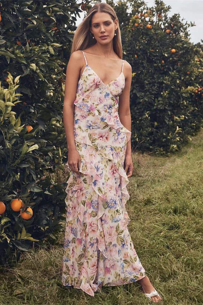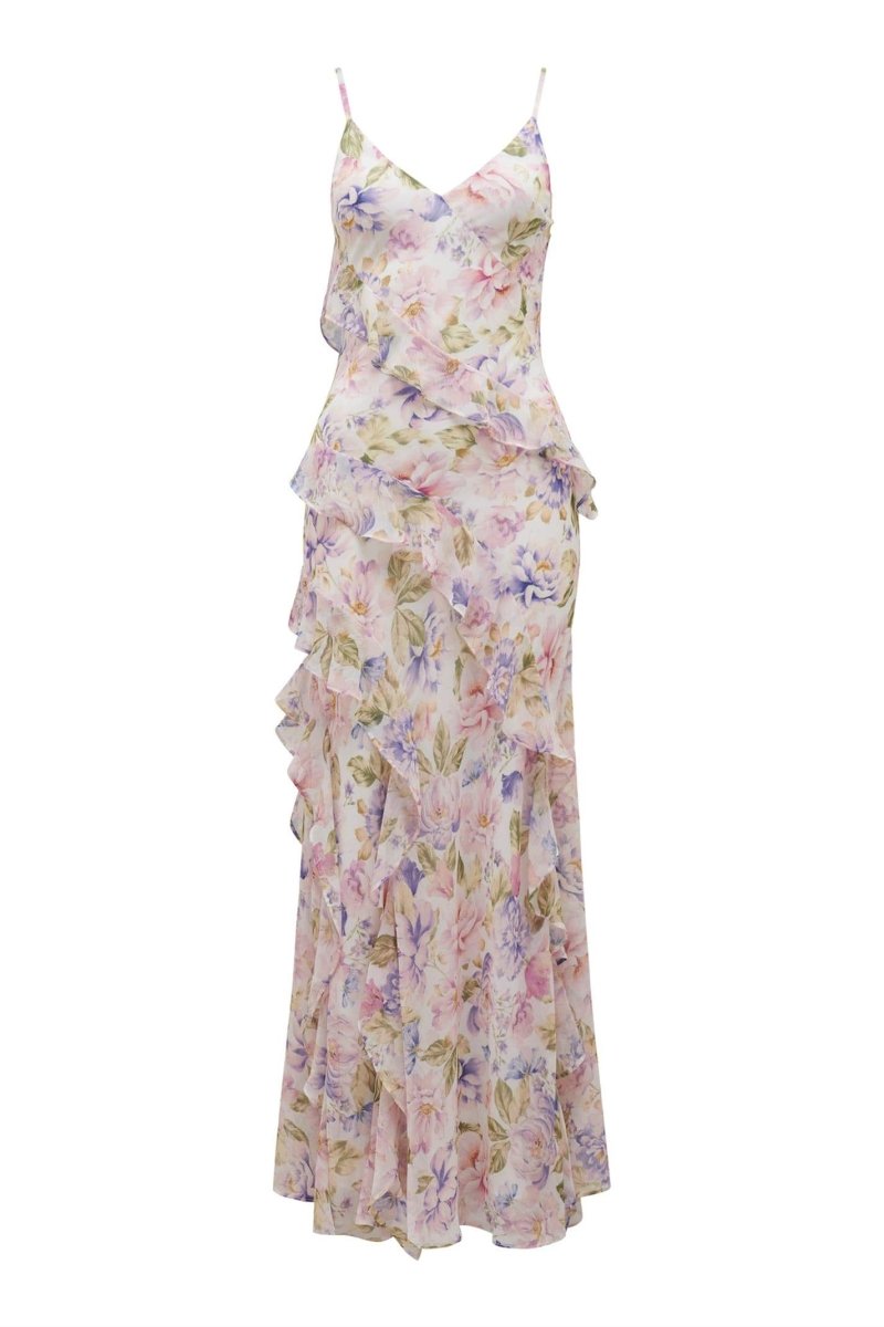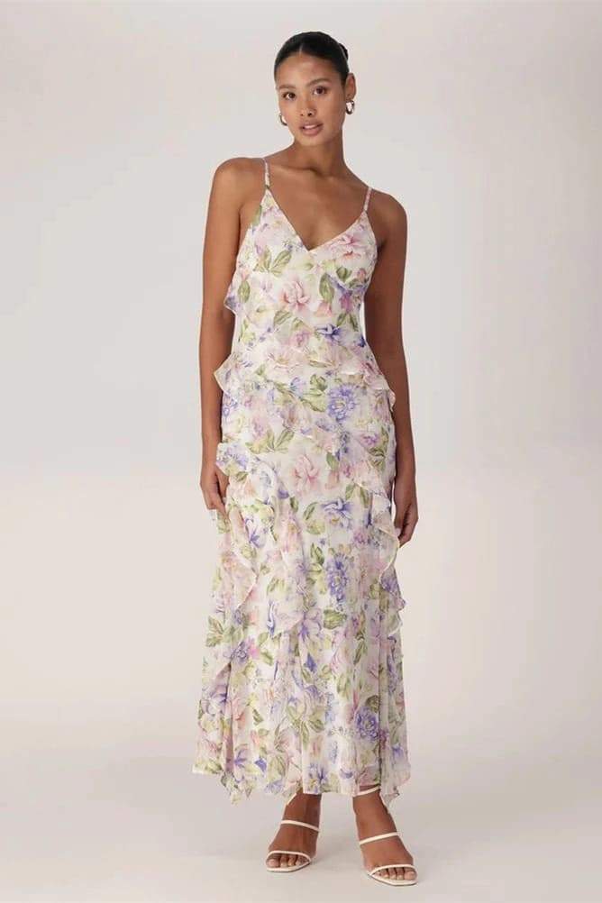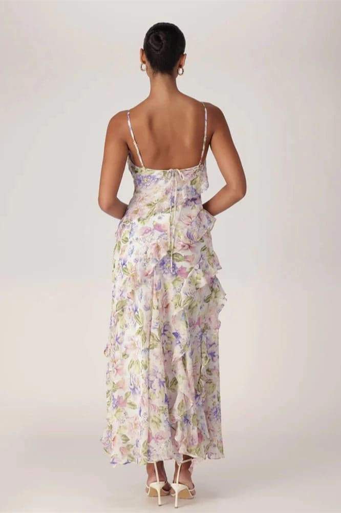 Agnes Baskılı Asimetrik Fırfırlı Maxi Elbise