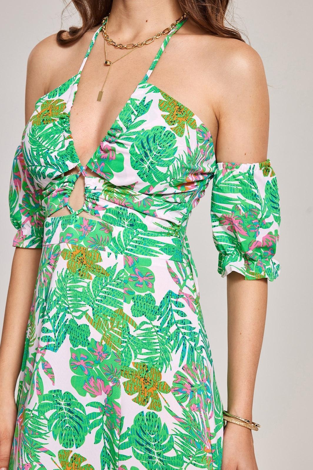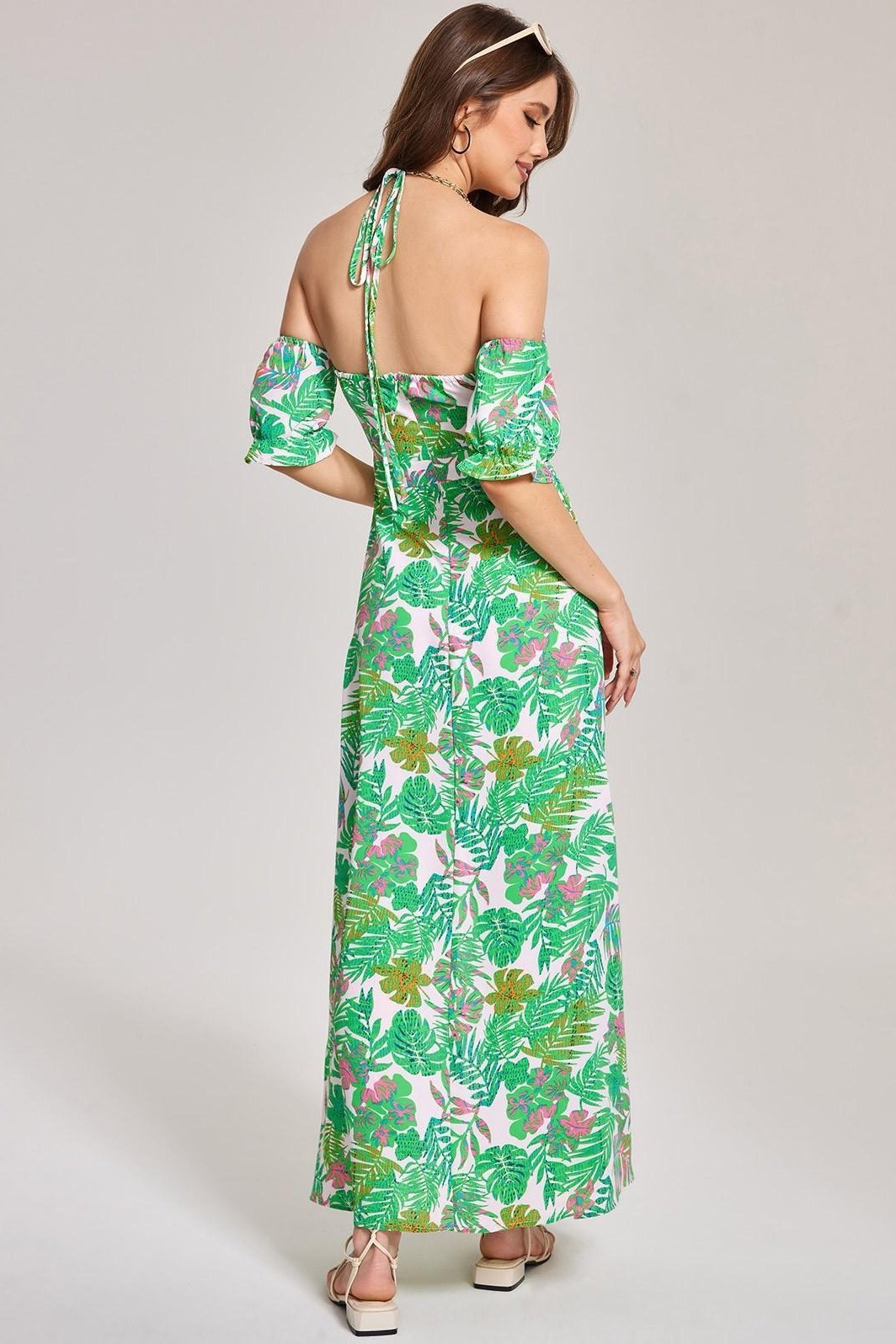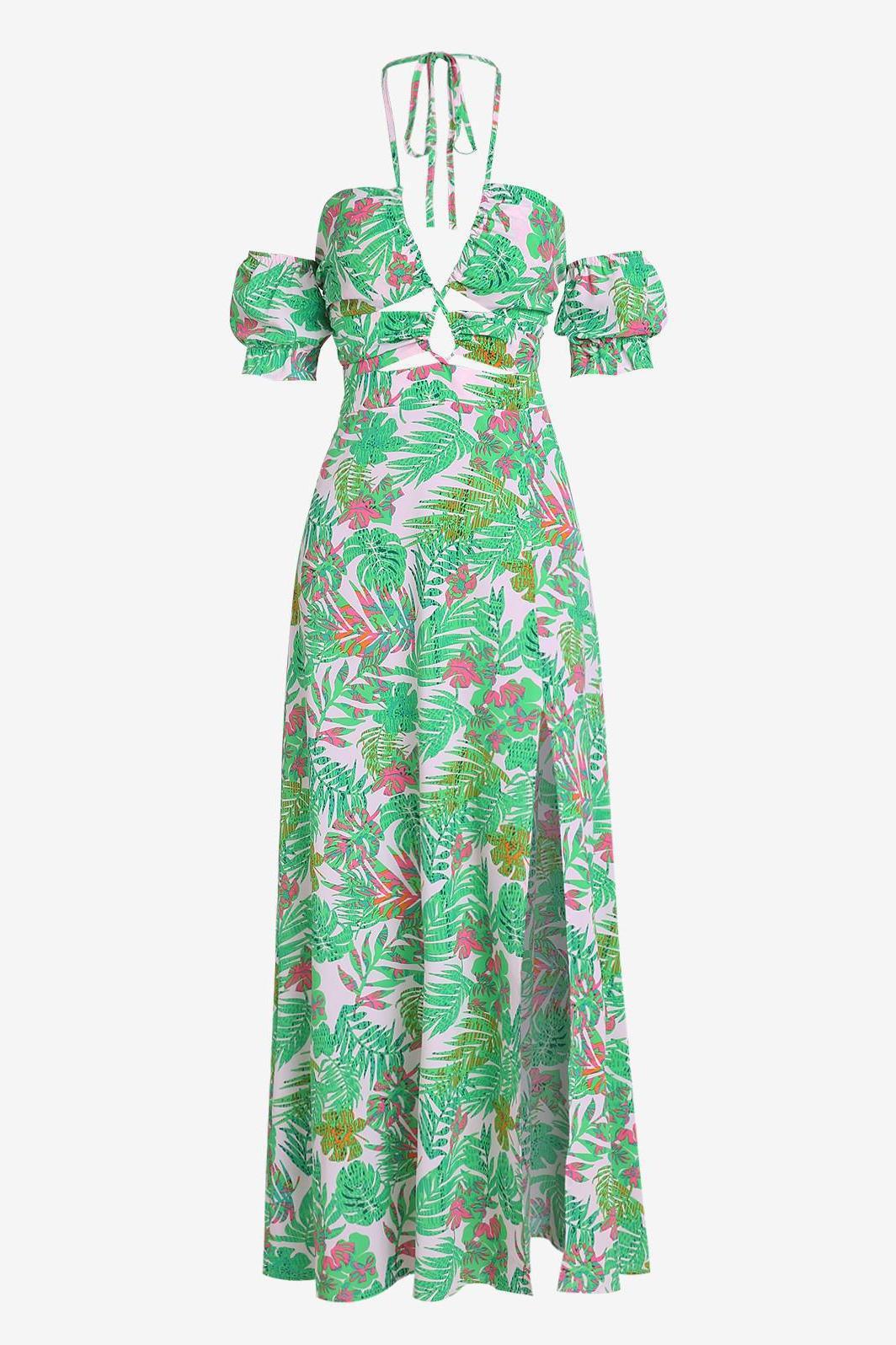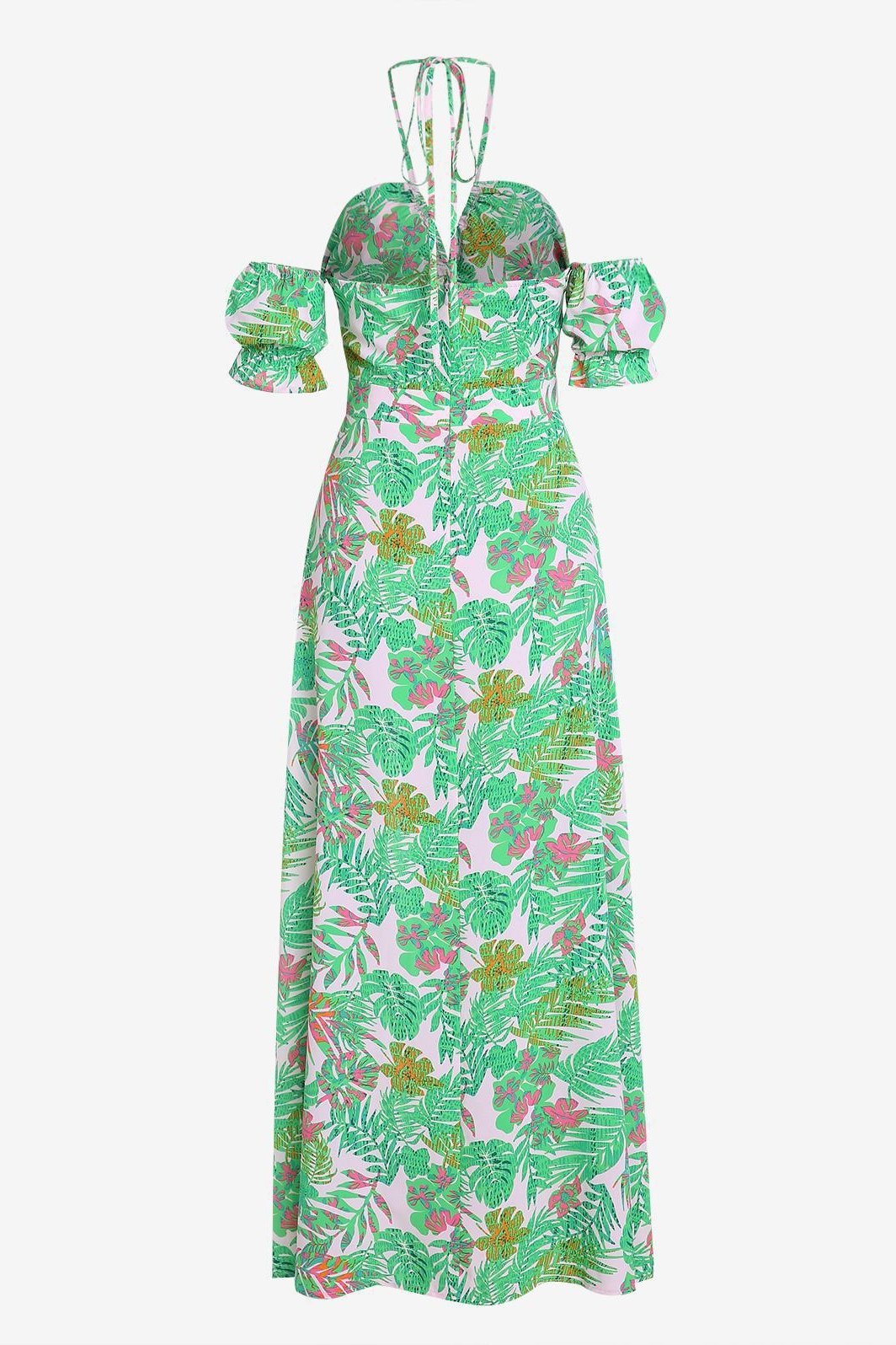 Apphia Baskılı Boyundan Bağlamalı Yırtmaçlı Midi Elbise