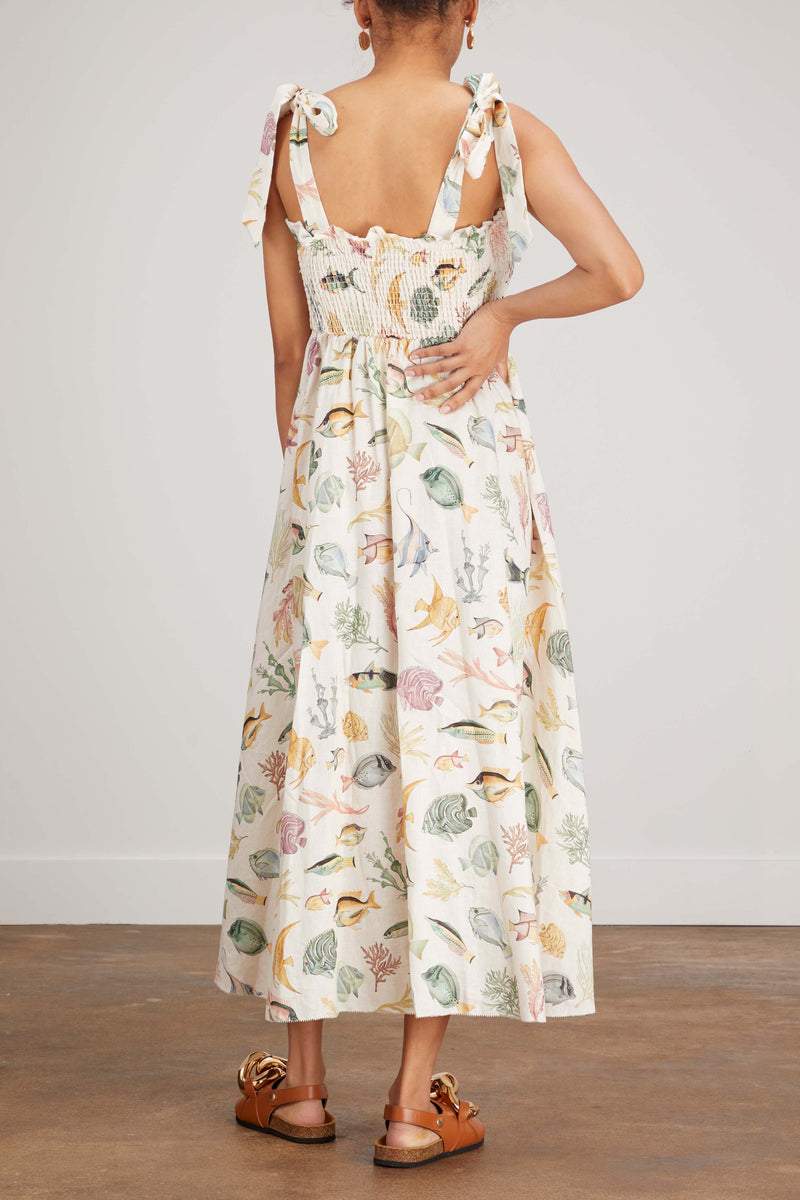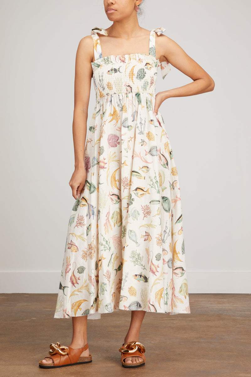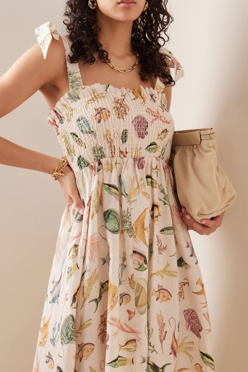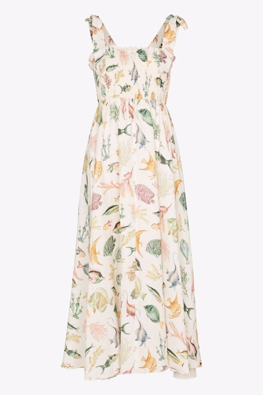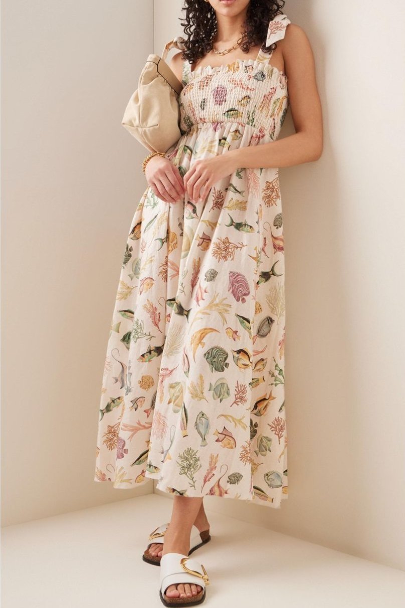Basia Baskılı Büzgülü Korsajlı Midi Keten Elbise