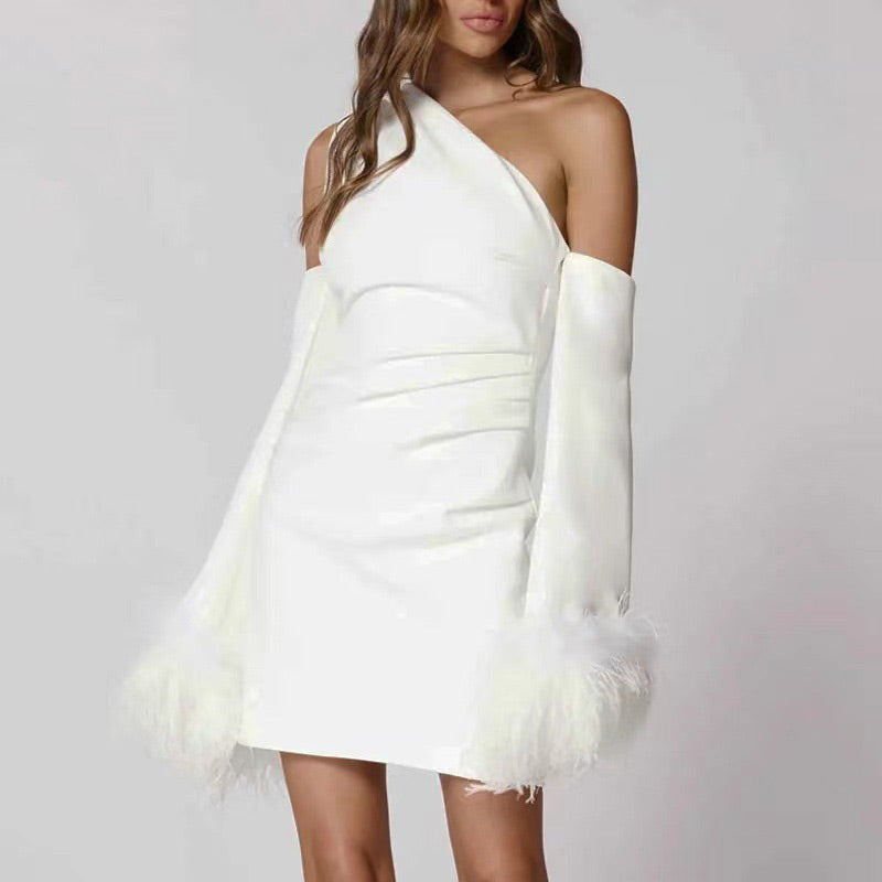 Alevna Siyah Asimetrik Tüy Detaylı Krep Uzun Kol Mini Elbise