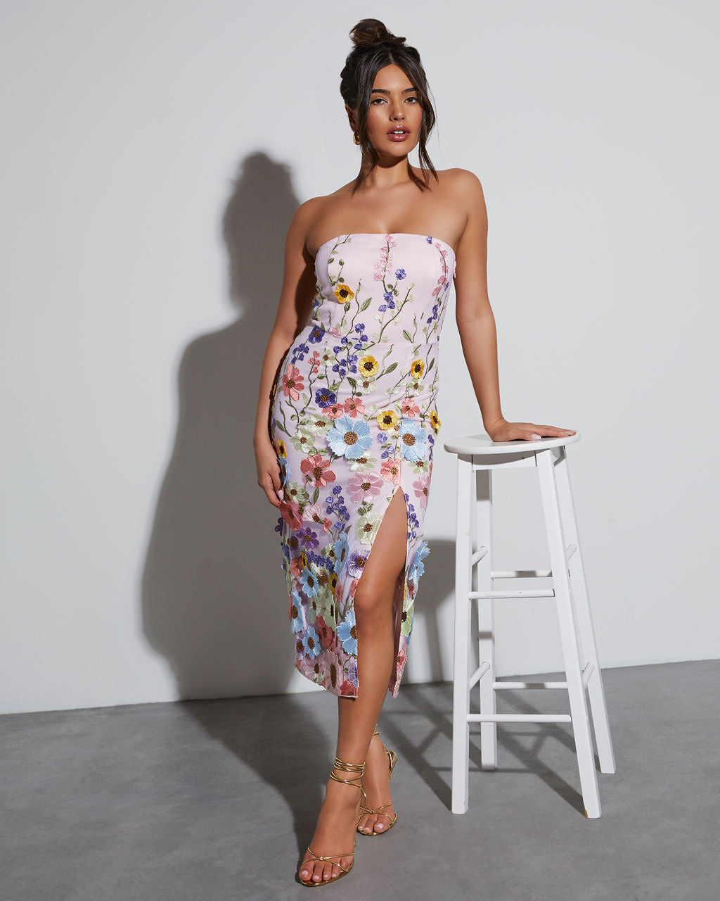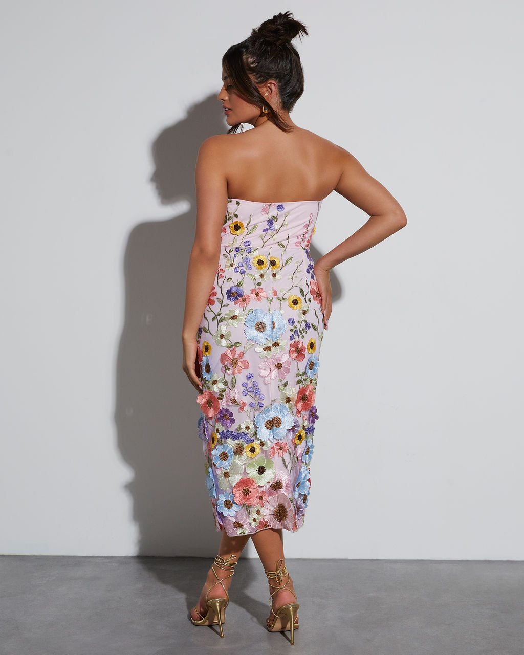 Cassie Straplez Çiçek İşlemeli Midi Elbise