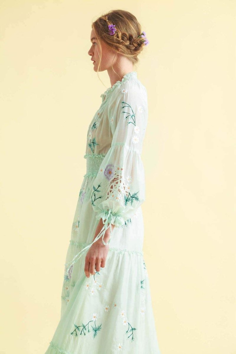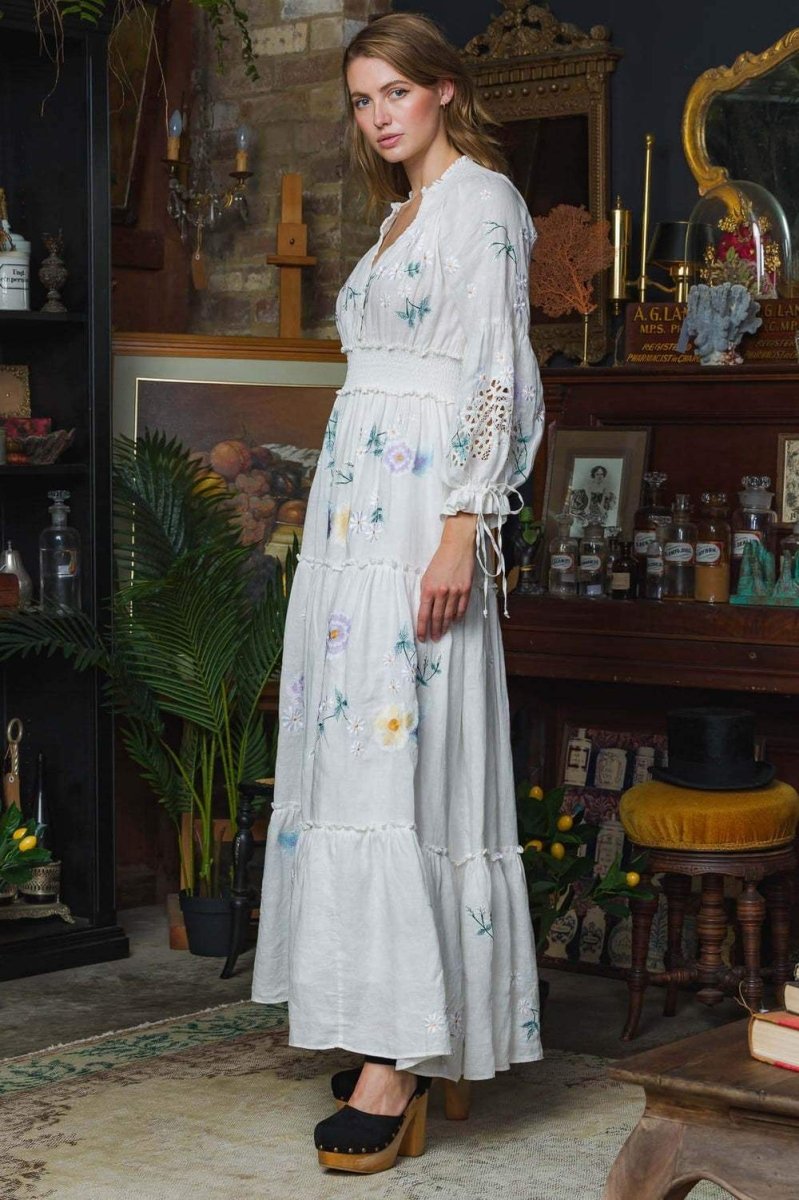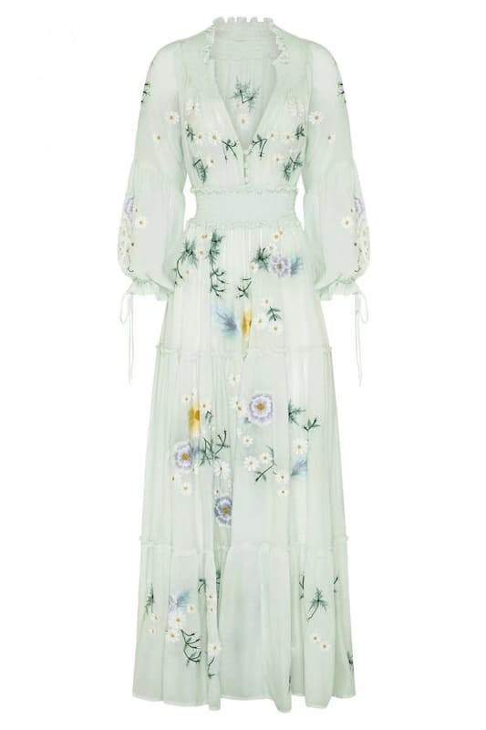 Cecilia İşlemeli V Yaka Büzgülü Maxi Elbise