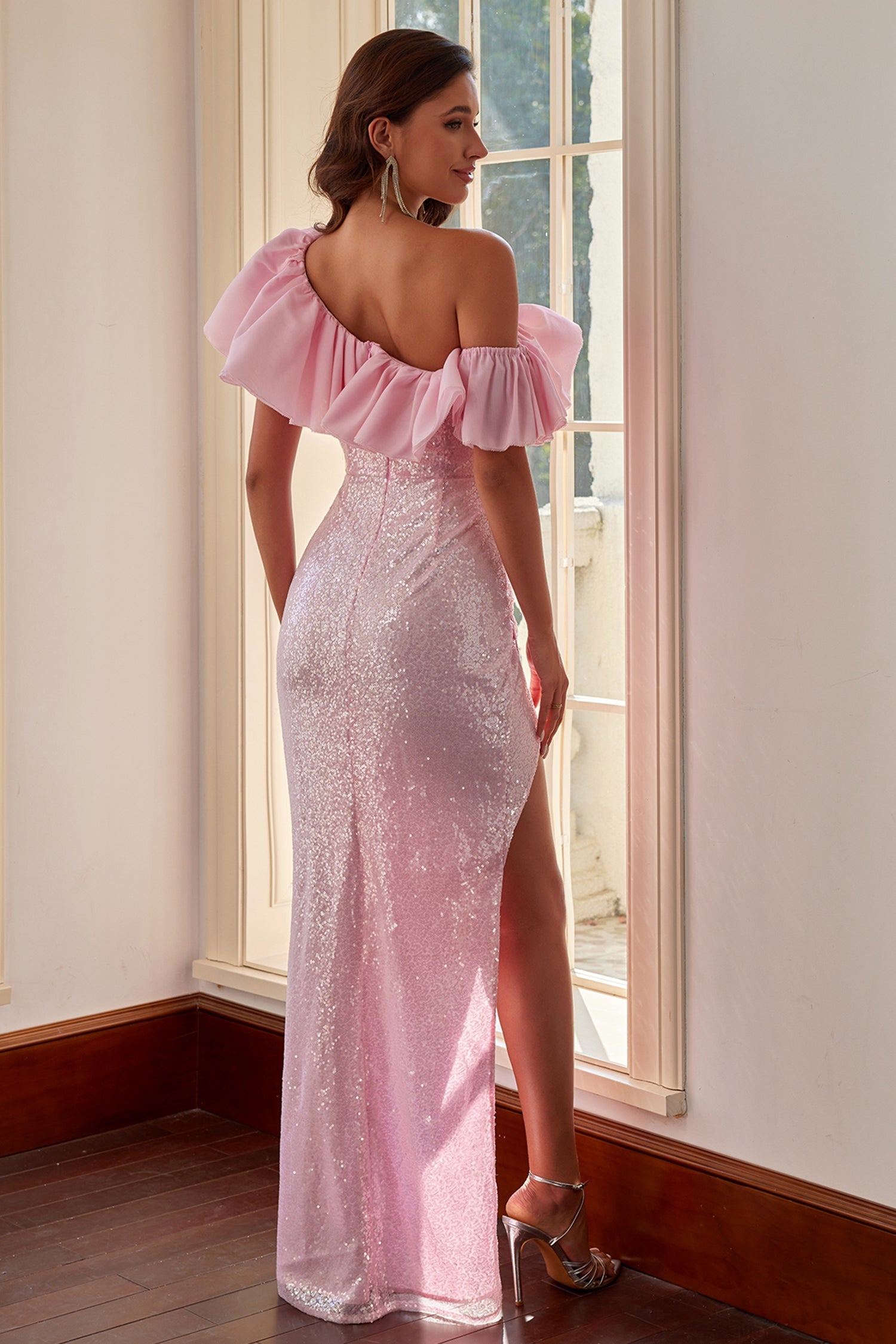 Claire Pembe Payet Fırfırlı Düşük Omuzlu Maxi Elbise