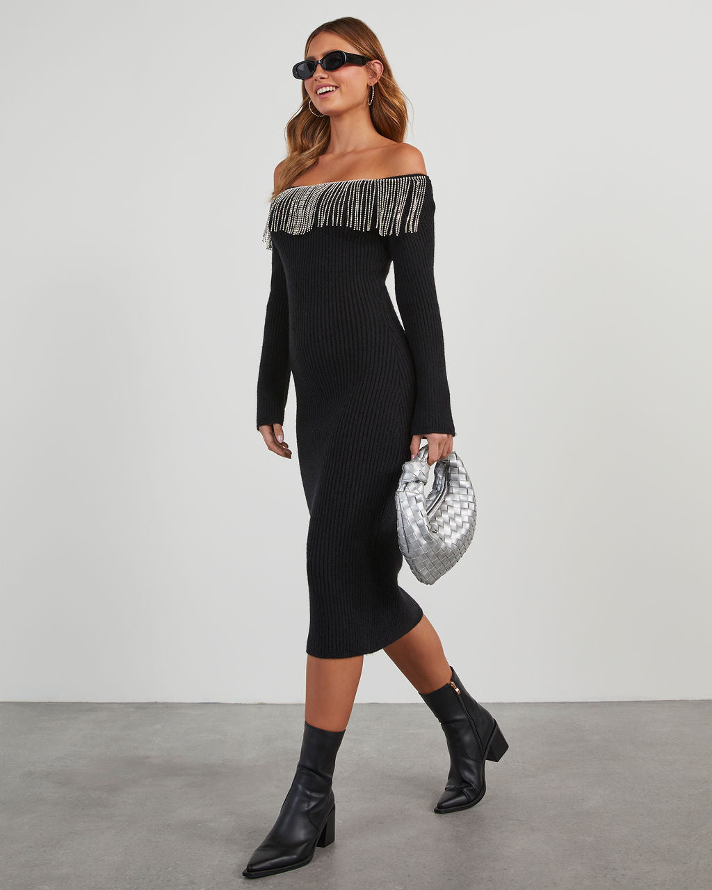 Dante Omuzu Açık Taşlı Püsküllü Midi Elbise