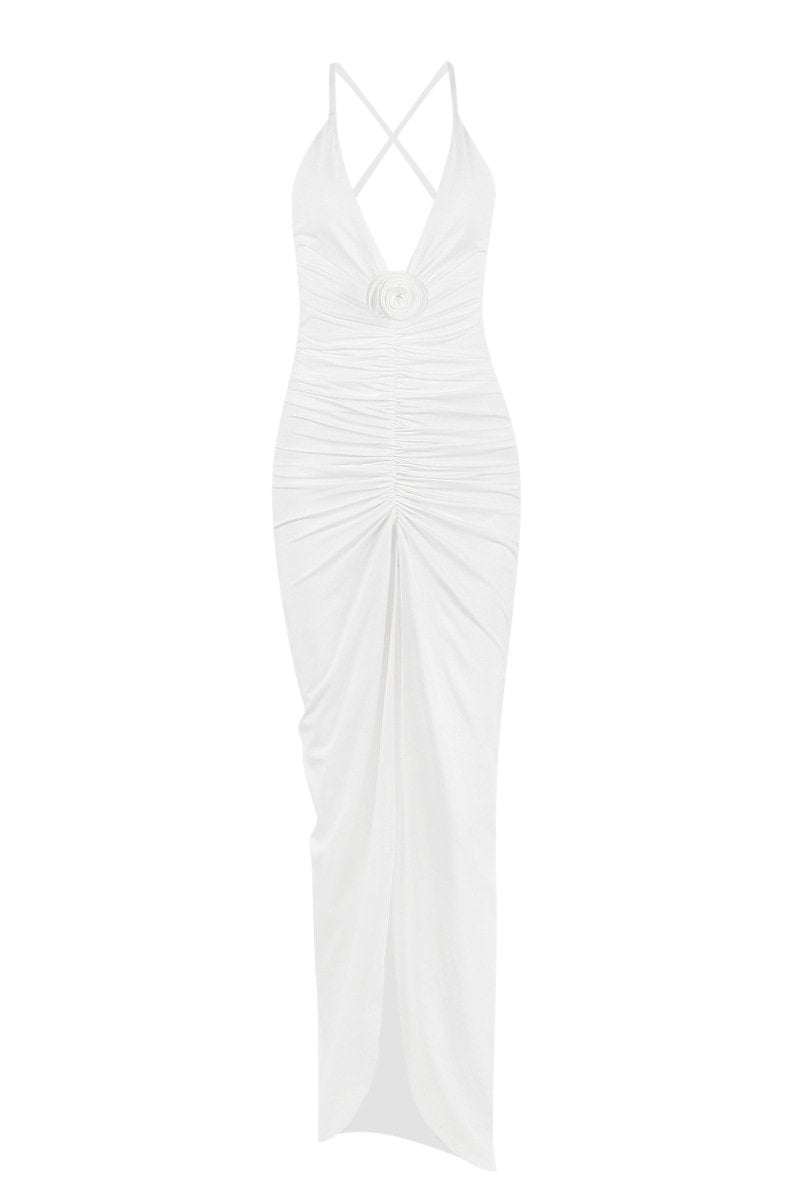 Şafak Çiçeği Büzgülü Yırtmaçlı Maxi Elbise