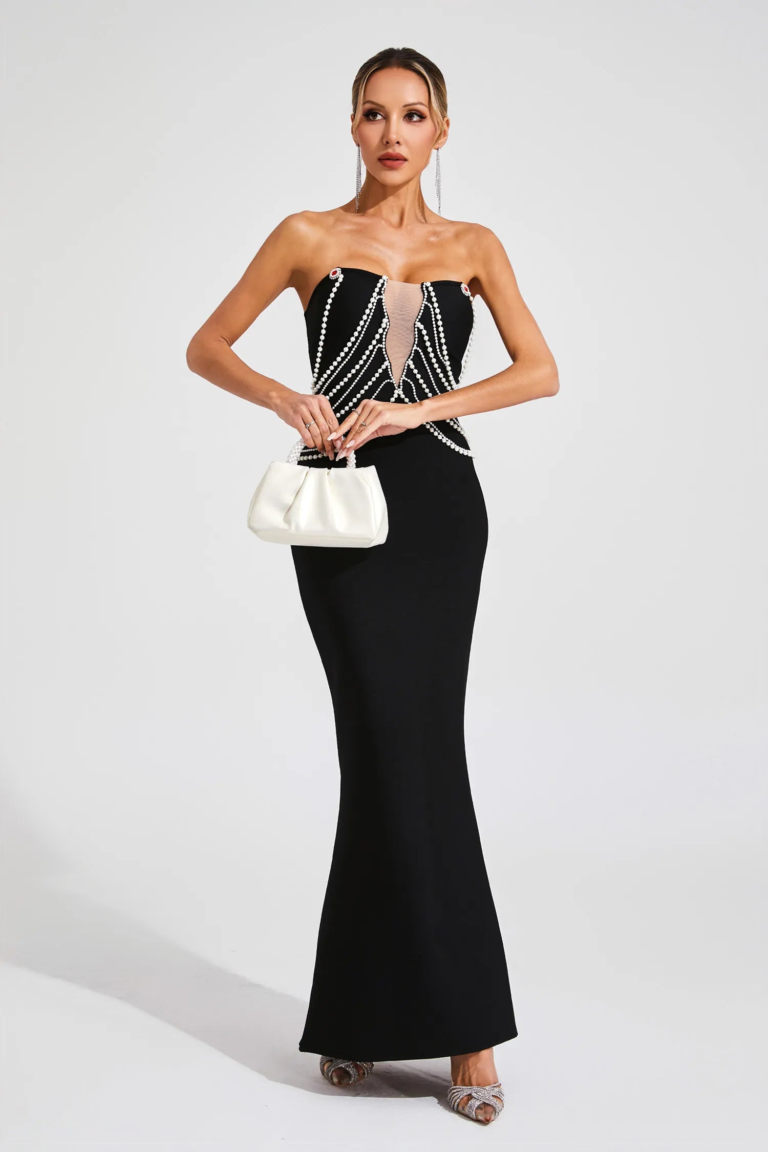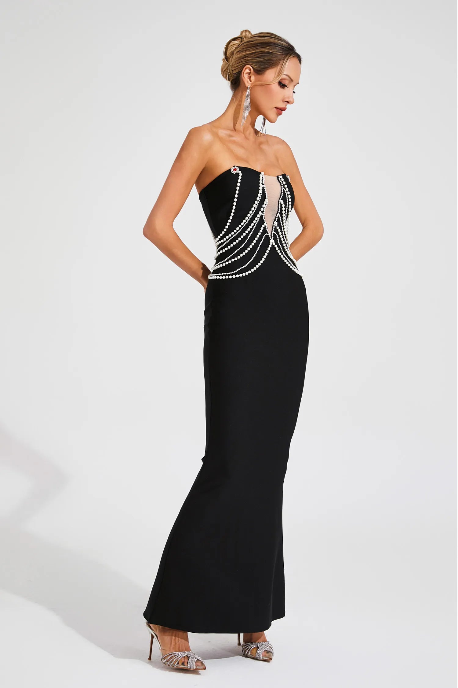 Delilah Siyah İncili Düşük Omuz Uzun Elbise