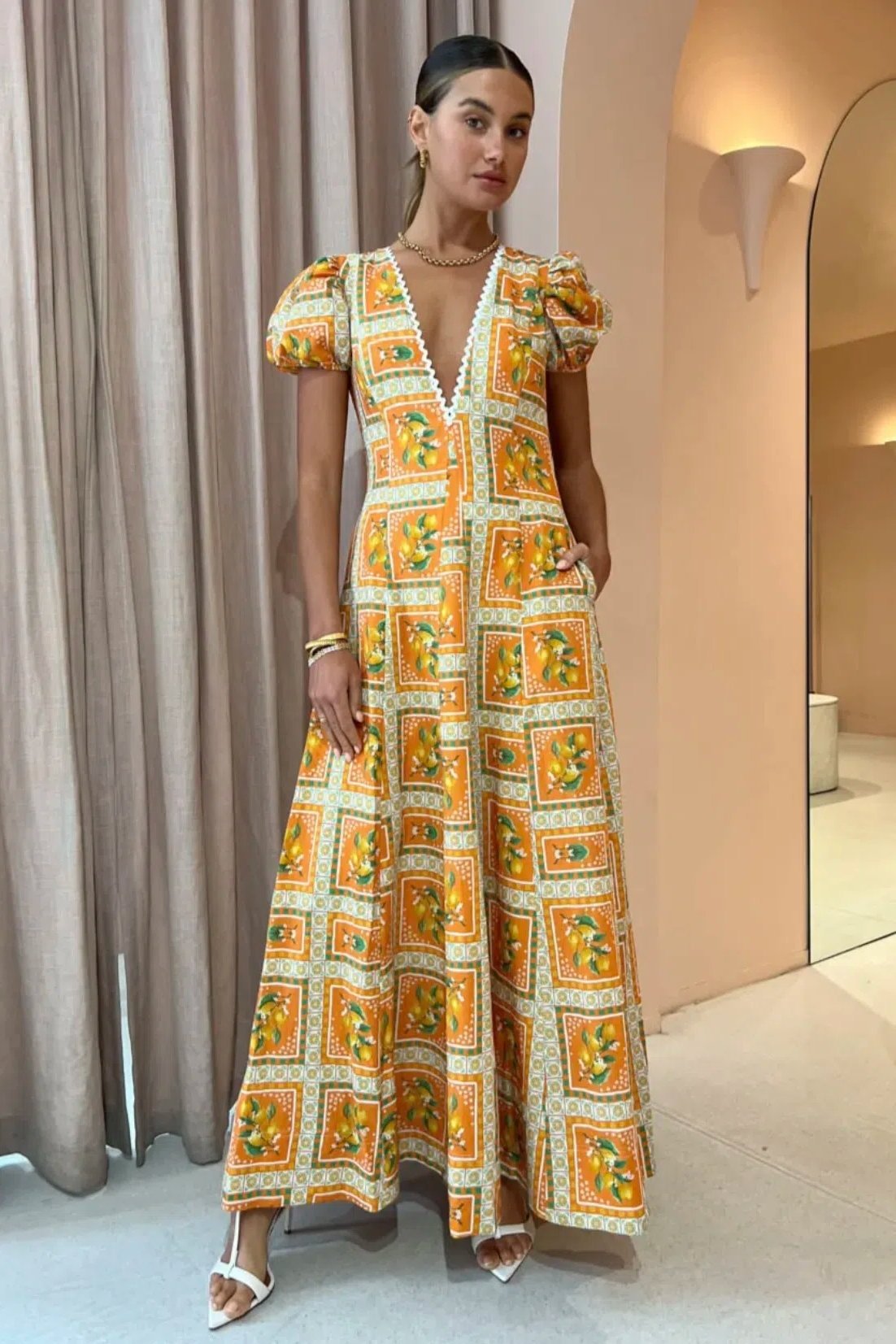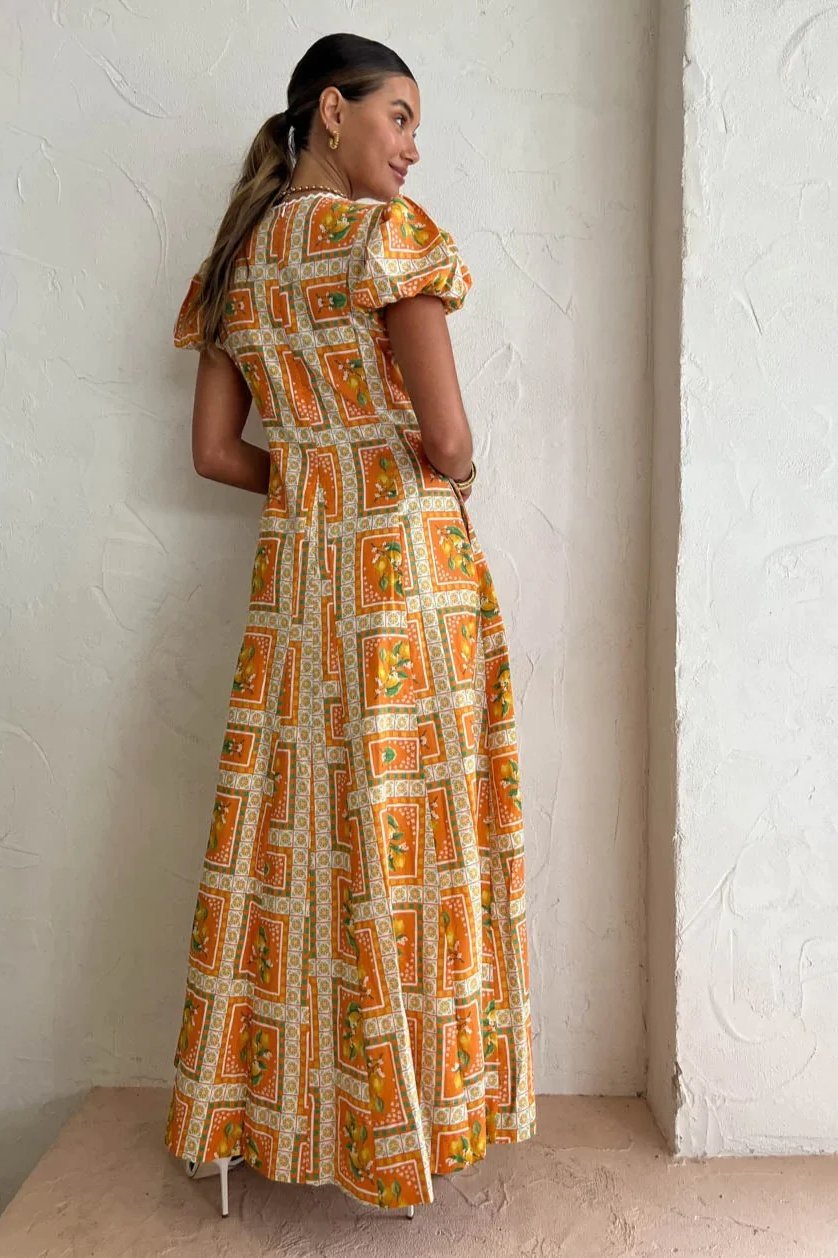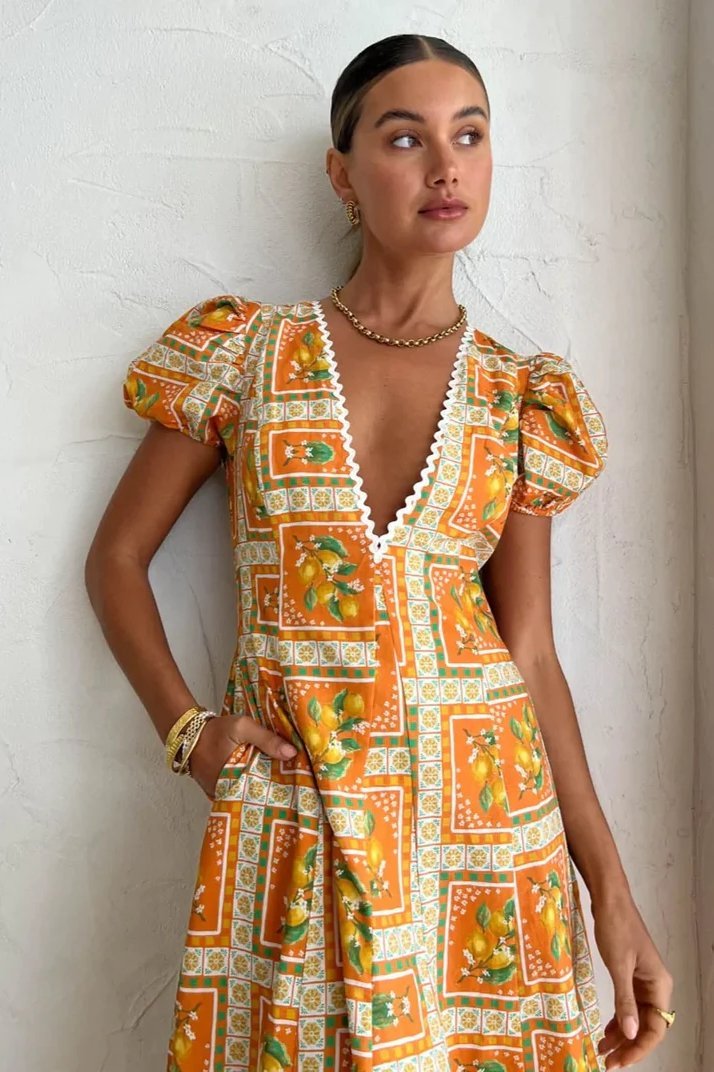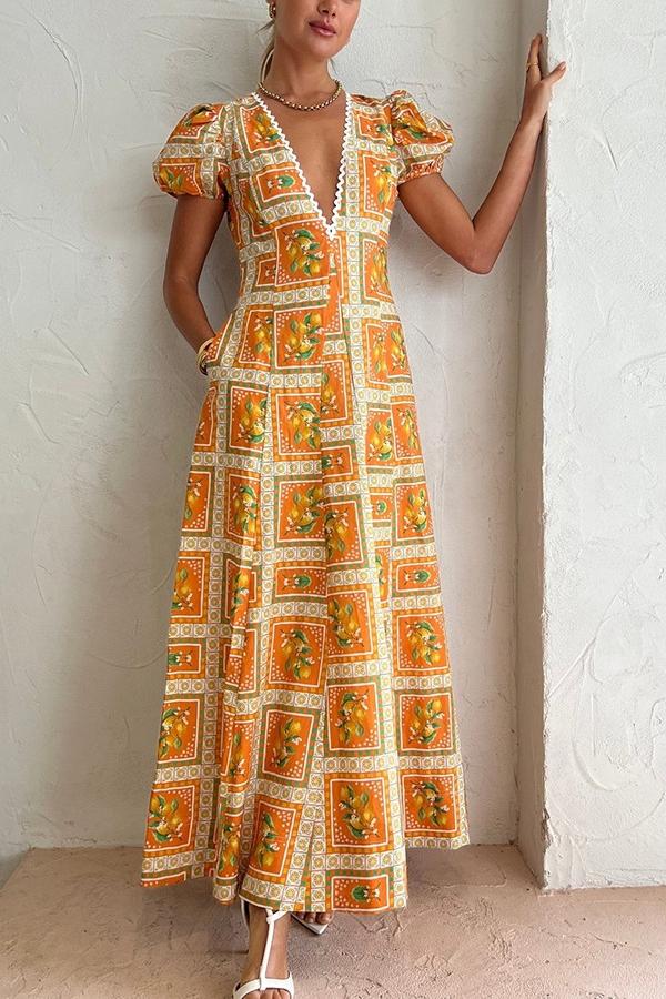 Doreen Baskılı V Yaka Uzun Elbise