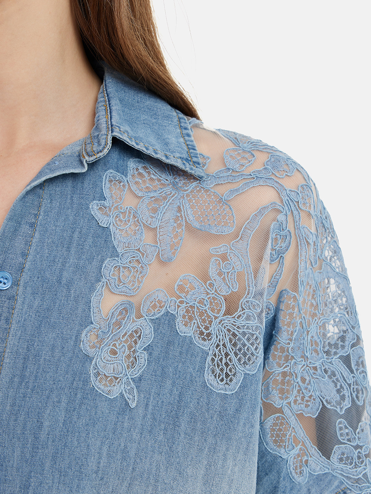 Çiçekli Dantel Panel Denim Gömlek