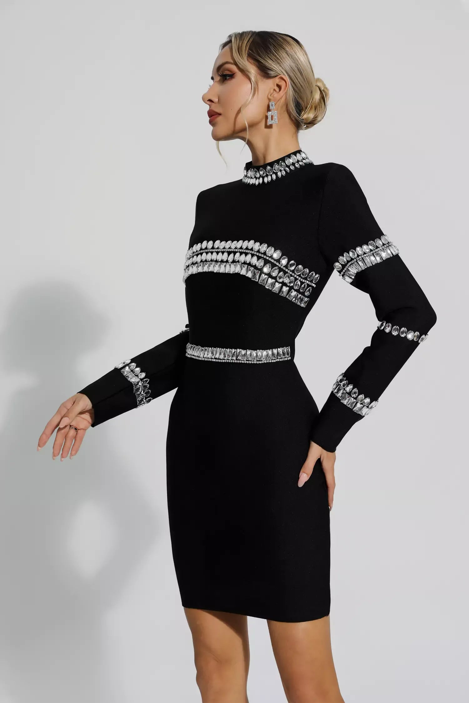 Hayley Siyah Pırlanta Taşlı Uzun Kollu Mini Elbise