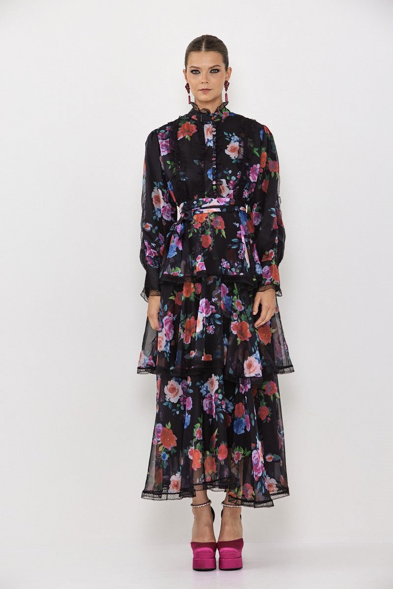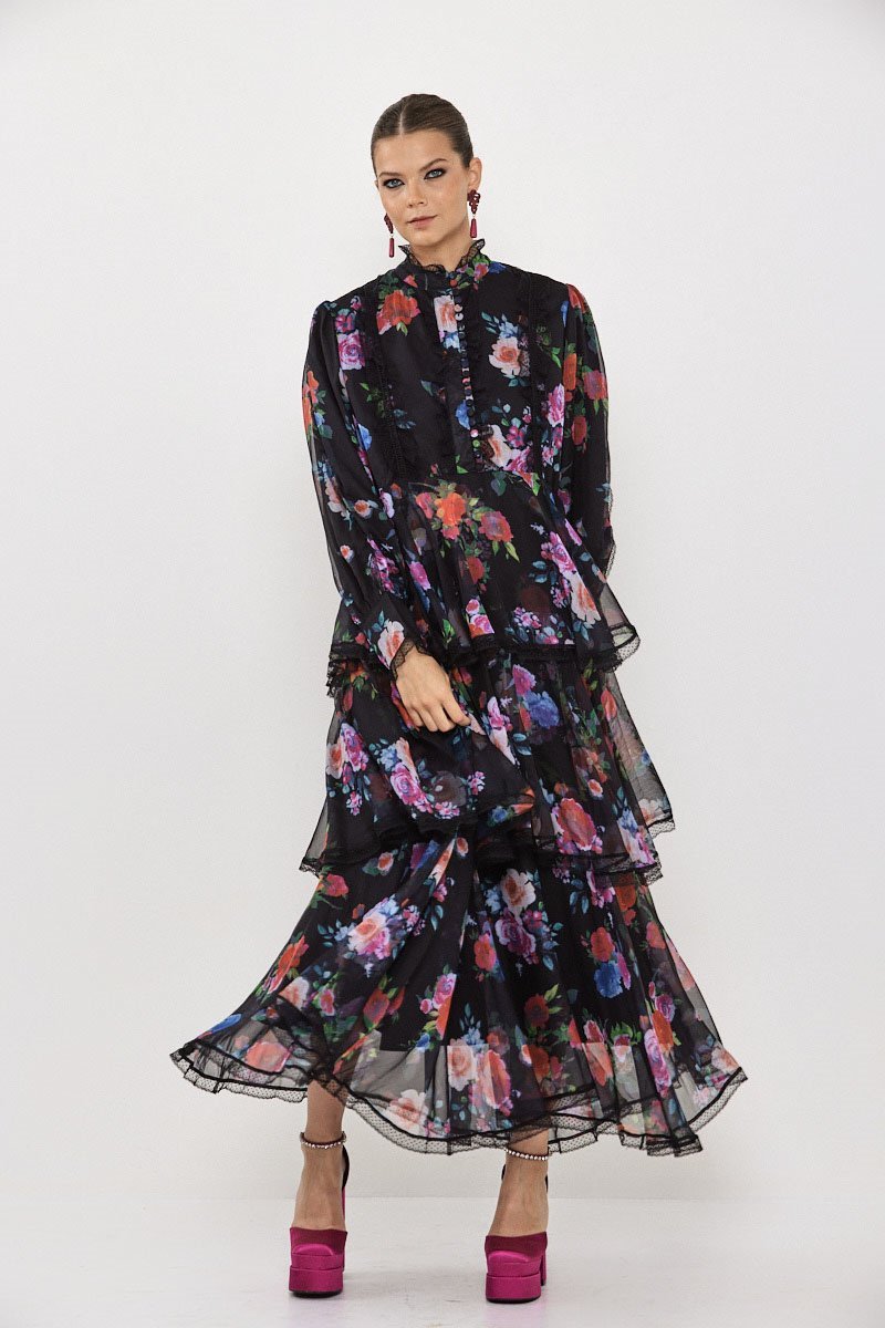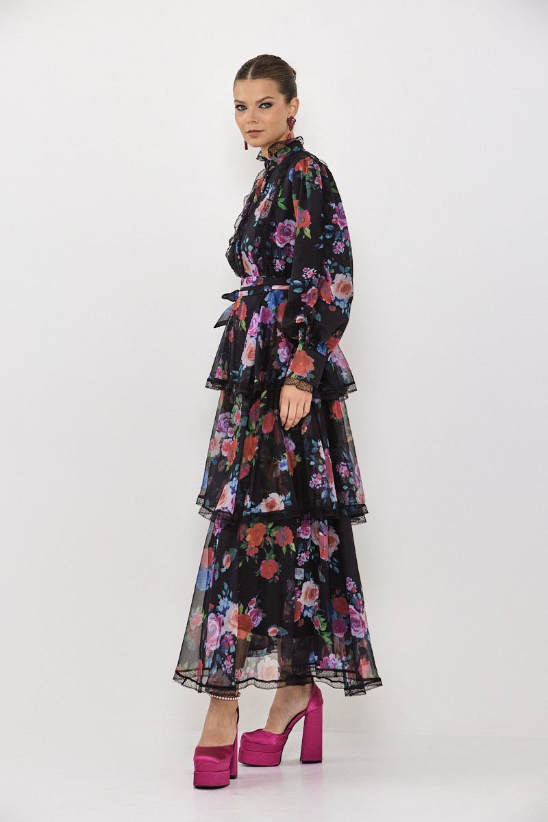 Hazel Çiçekli Katlı Şifon Maxi Elbise