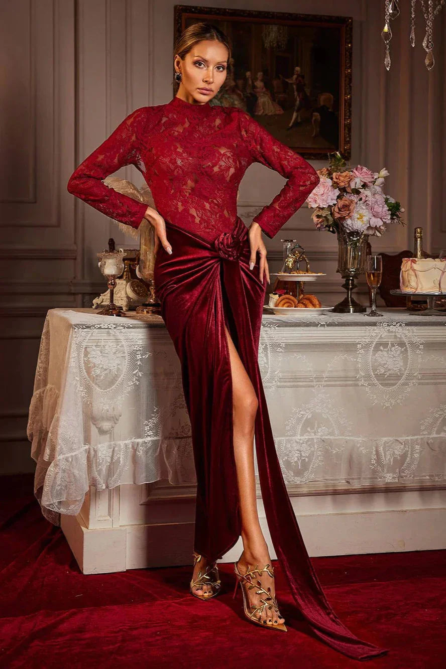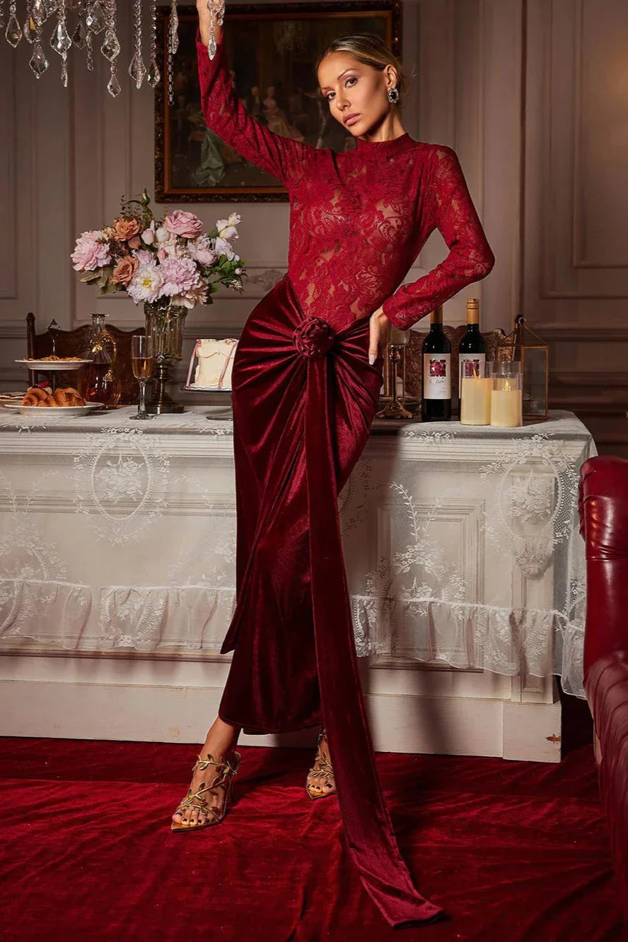 Hazel Çiçek Dantelli Bölünmüş Dantel Kadife Maxi Elbise