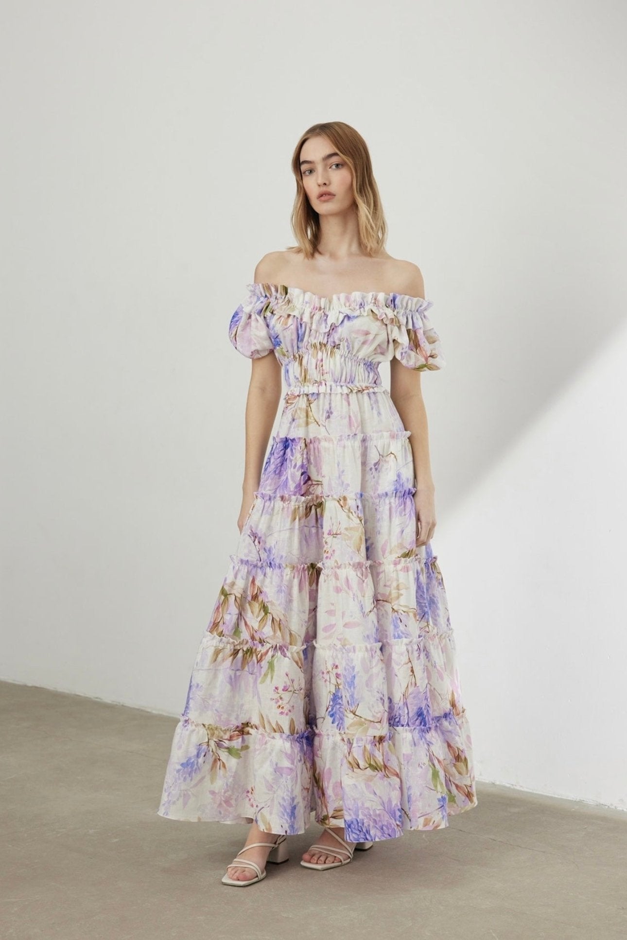 Heather Baskılı Fırfırlı Katlı Uzun Elbise