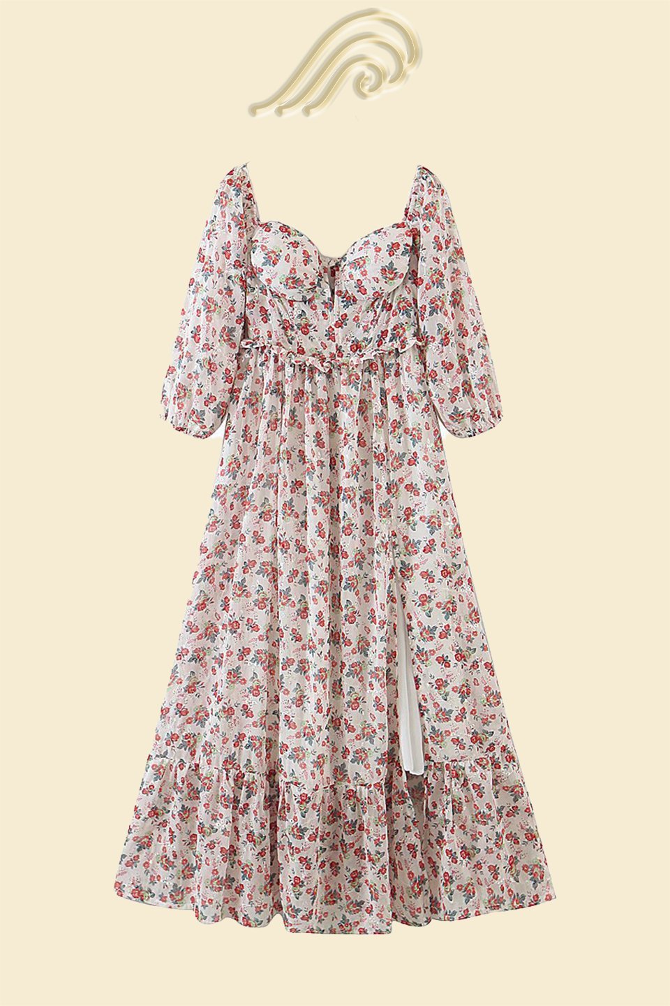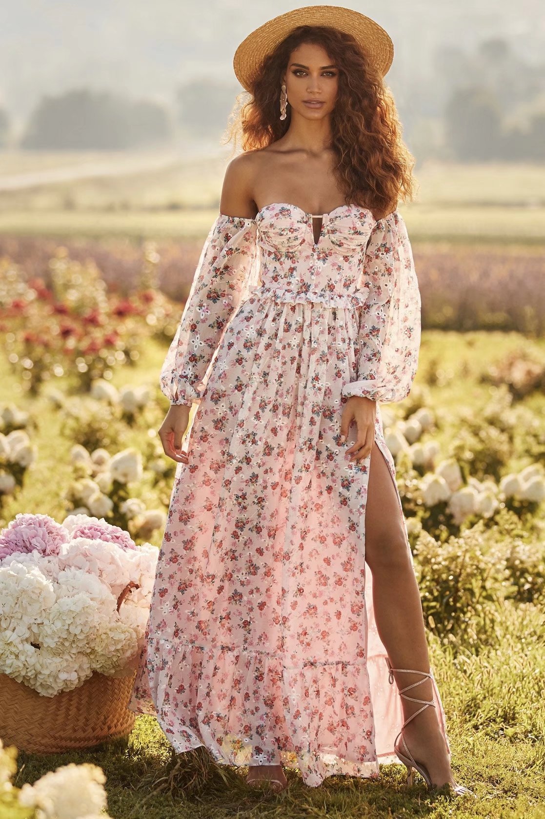 Helena Baskılı Nakışlı Düşük Omuz Maxi Elbise