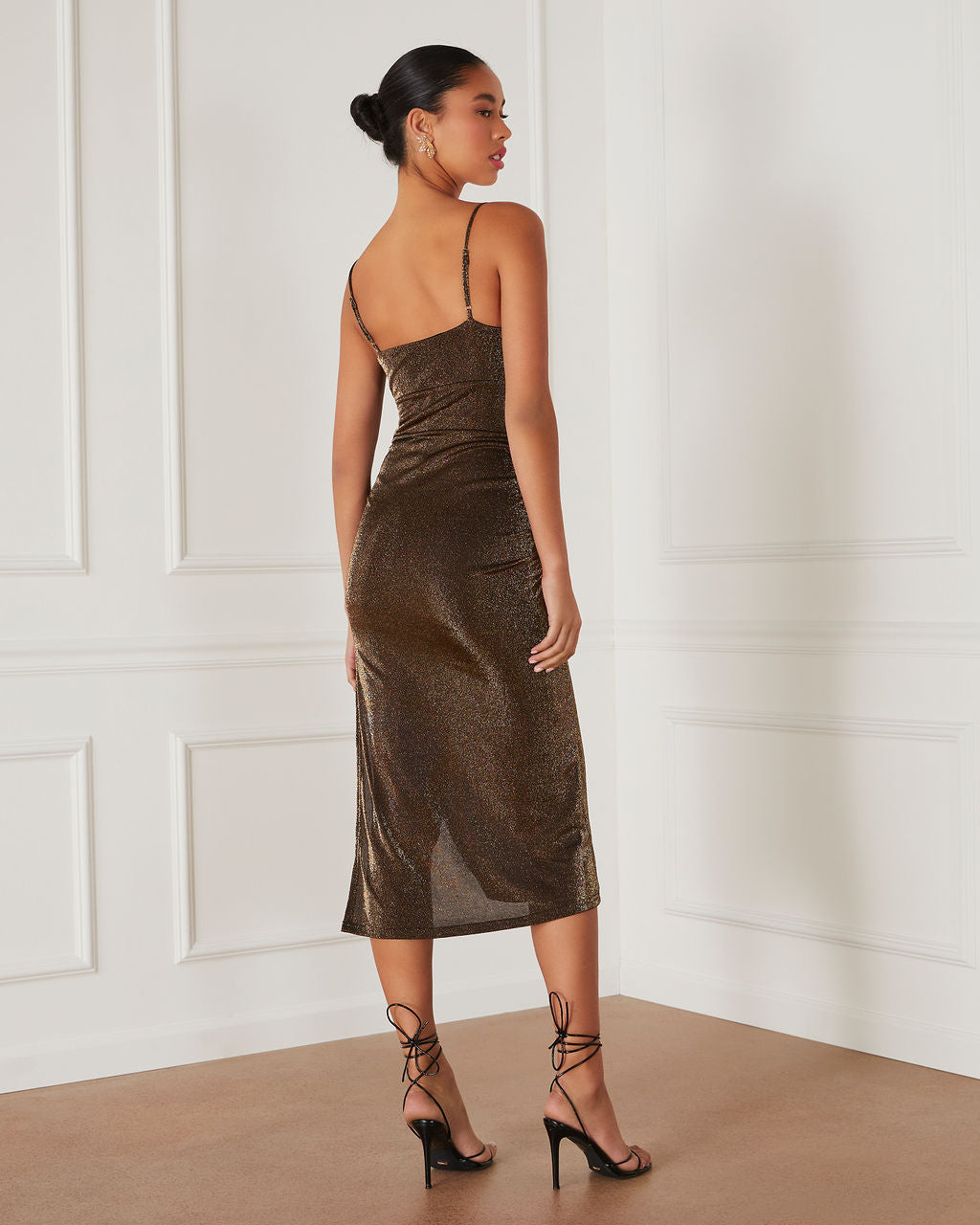 Holidate Gece Metalik Örgü Yırtmaçlı Midi Elbise