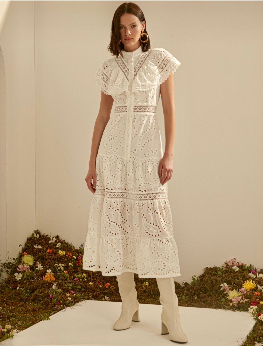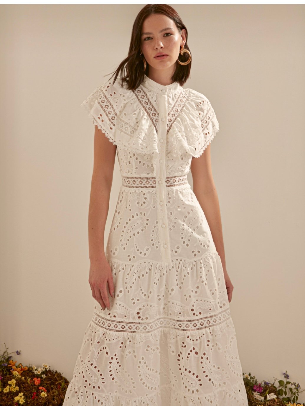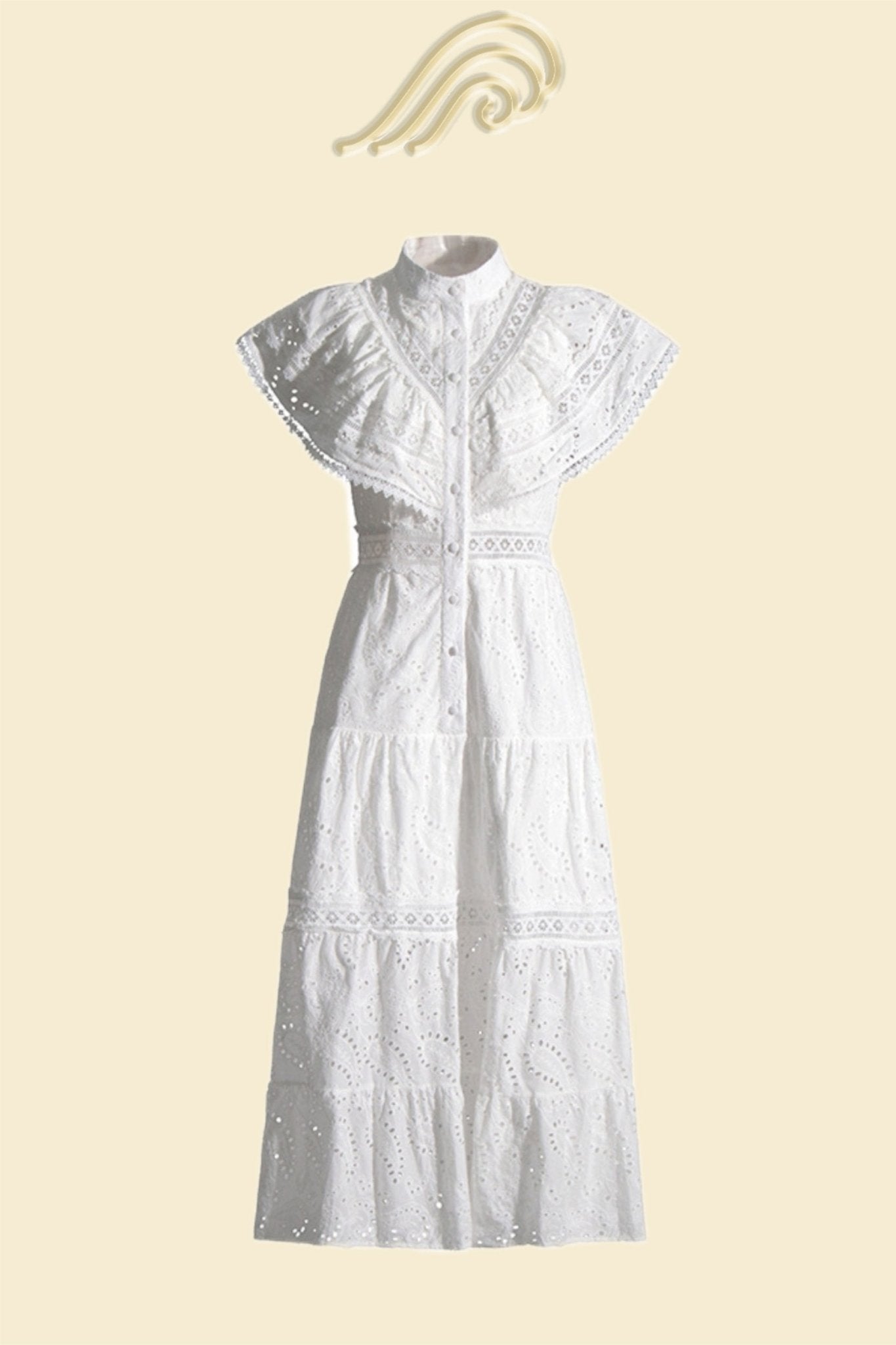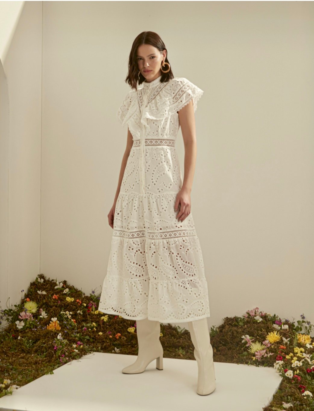 Kit Nakışlı Dantel Fırfırlı Düğmeli Midi Elbise