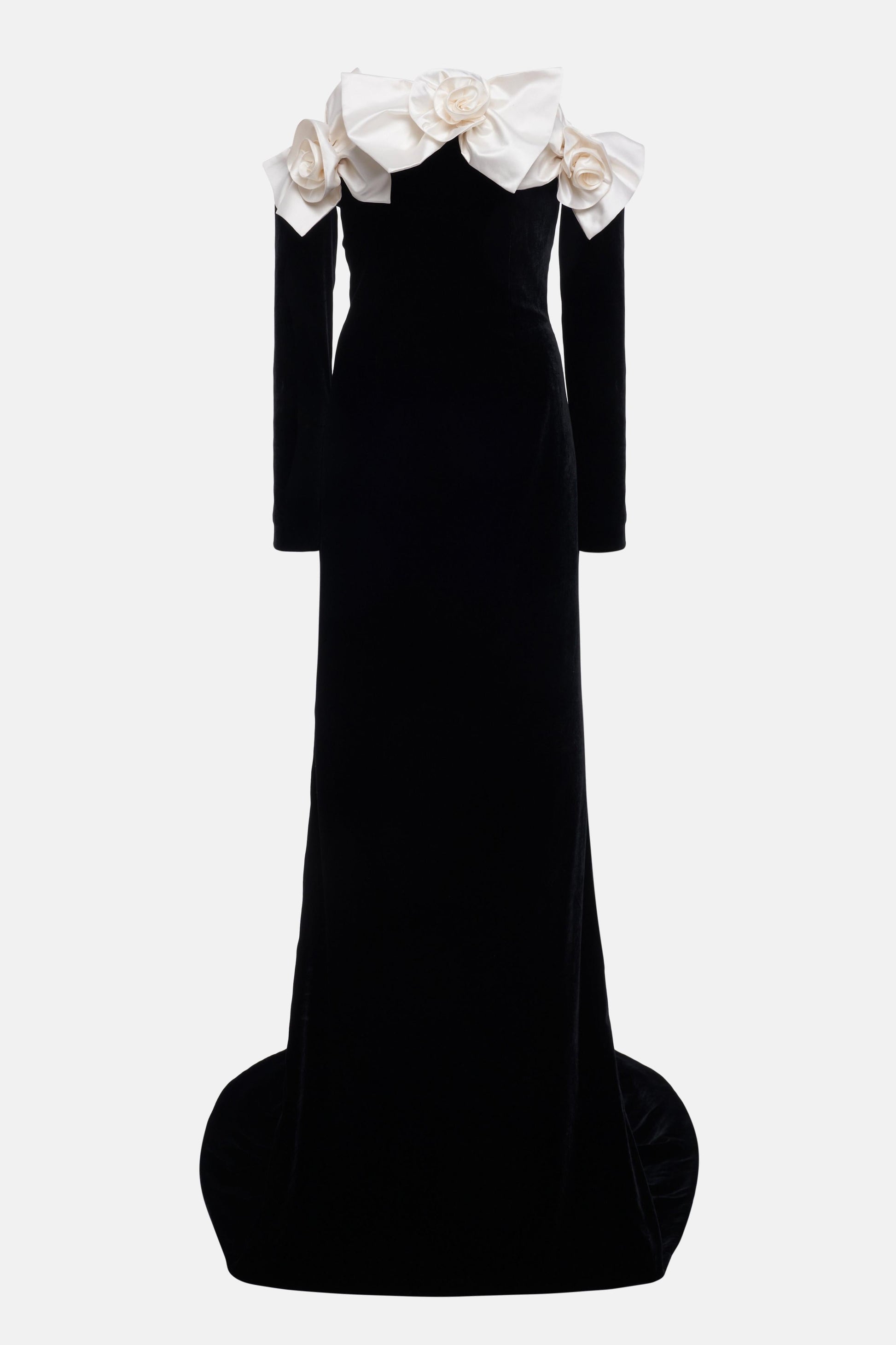 Lara Papyonlu Omuzu Açık Kadife Uzun Elbise