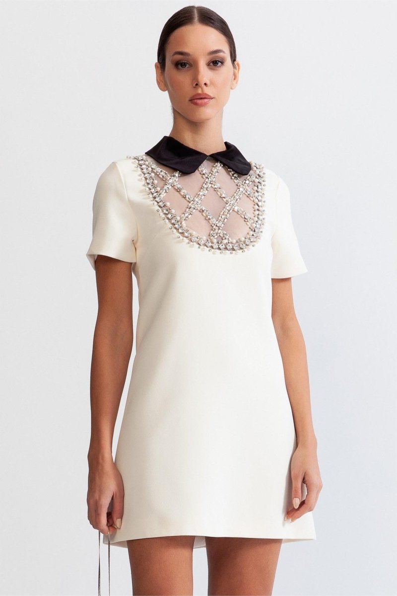 Leila Boncuk İşlemeli Peter Pan Yaka Mini Elbise