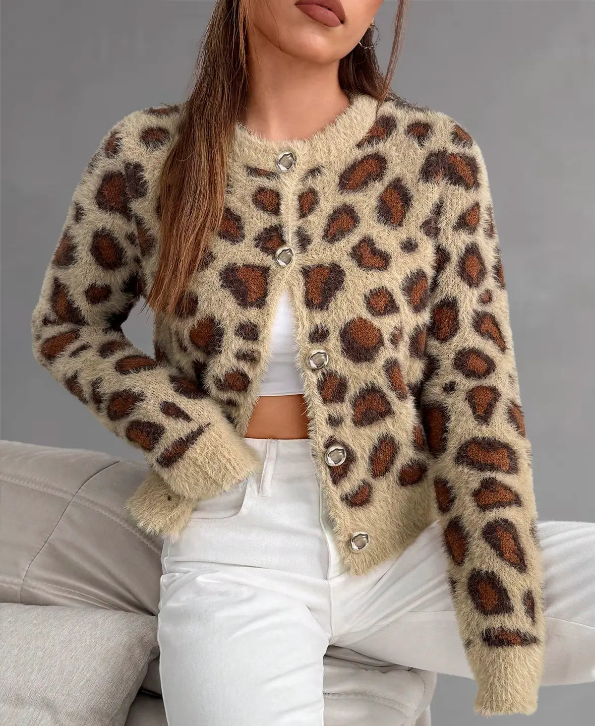 Alevna™ Leopar Desenli Tüylü Triko Hırka