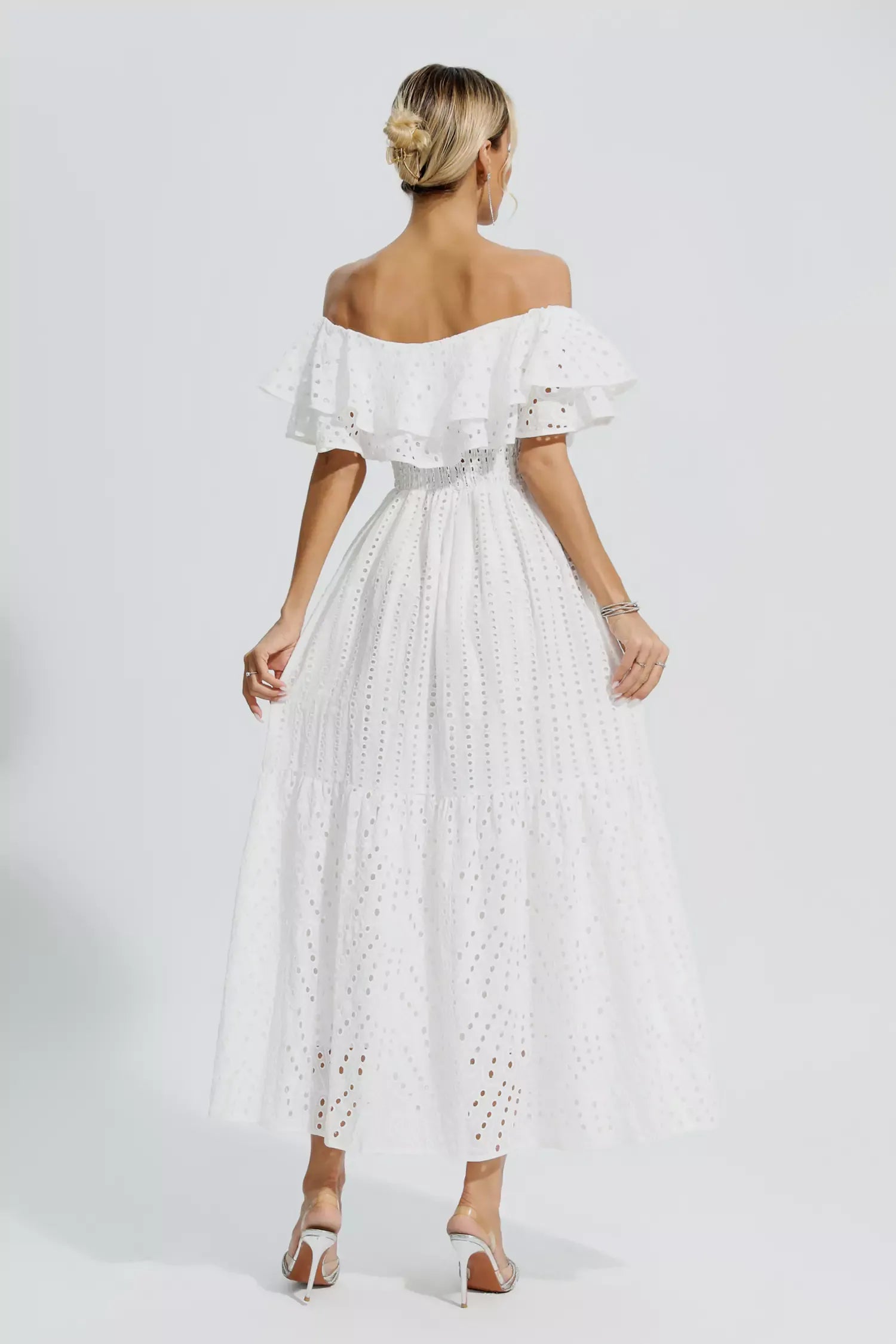 Malani Beyaz Kesim Fırfırlı Maxi Elbise